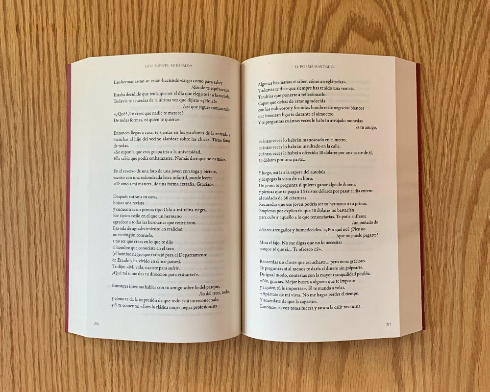 Antología de ensayos, narraciones personales y poemas escritos por mujeres de ascendencia chicana, latina, indígena, asiática y africana en suma, mujeres de color que viven en los Estados Unidos. Esta puente, mi espalda es la traducción y adaptación al español de la antología This Bridge Called My Back: Writings by Radical Women of Color que redactaron y recopilaron Cherríe Moraga y Gloria Anzaldúa, chicanas geniales e innovadoras de familias humildes. Las múltiples autoras de Esta puente, mi espalda manifiestan una amplia variedad de perspectivas culturales y planteamientos de feminismo que van mucho más allá de las preocupaciones de feministas de las clases profesionales y adineradas.