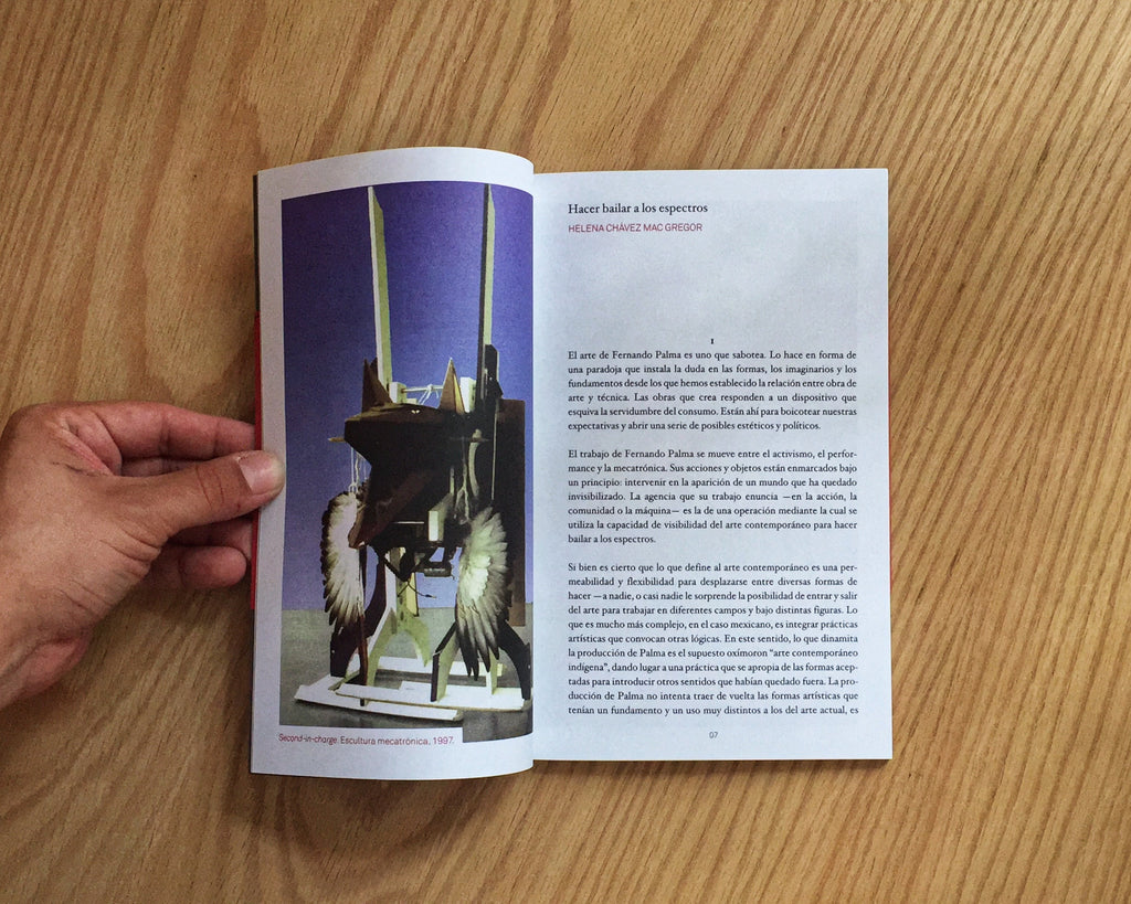 El trabajo de Fernando Palma se mueve entre el activismo, el performance y la mecatrónica. Sus acciones y objetos se guían bajo el principio de intervenir en la aparición de un mundo que ha quedado invisibilizado. Utiliza la capacidad de visibilidad del arte contemporáneo para hacer bailar los espectros. Lo que dinamita la producción de Palma es el supuesto oxímoron arte contemporáneo indígena, dando lugar a una práctica que se apropia de las formas aceptadas para introducir otros sentidos que habían quedado fuera.